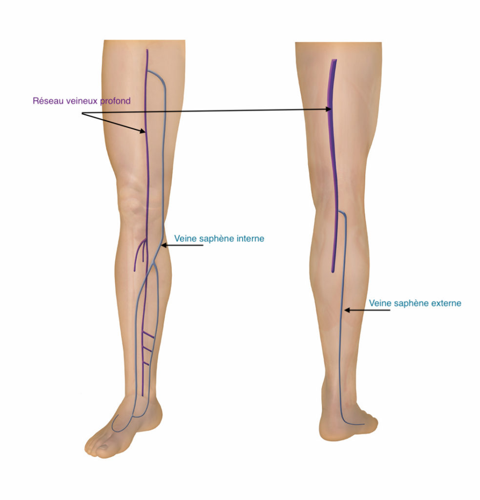 - Les varices tronculaires : Vont concerner la veine saphène interne (grande saphène) ou la veine saphène externe (petite saphène) et leurs affluents, de premier ou de second ordre.